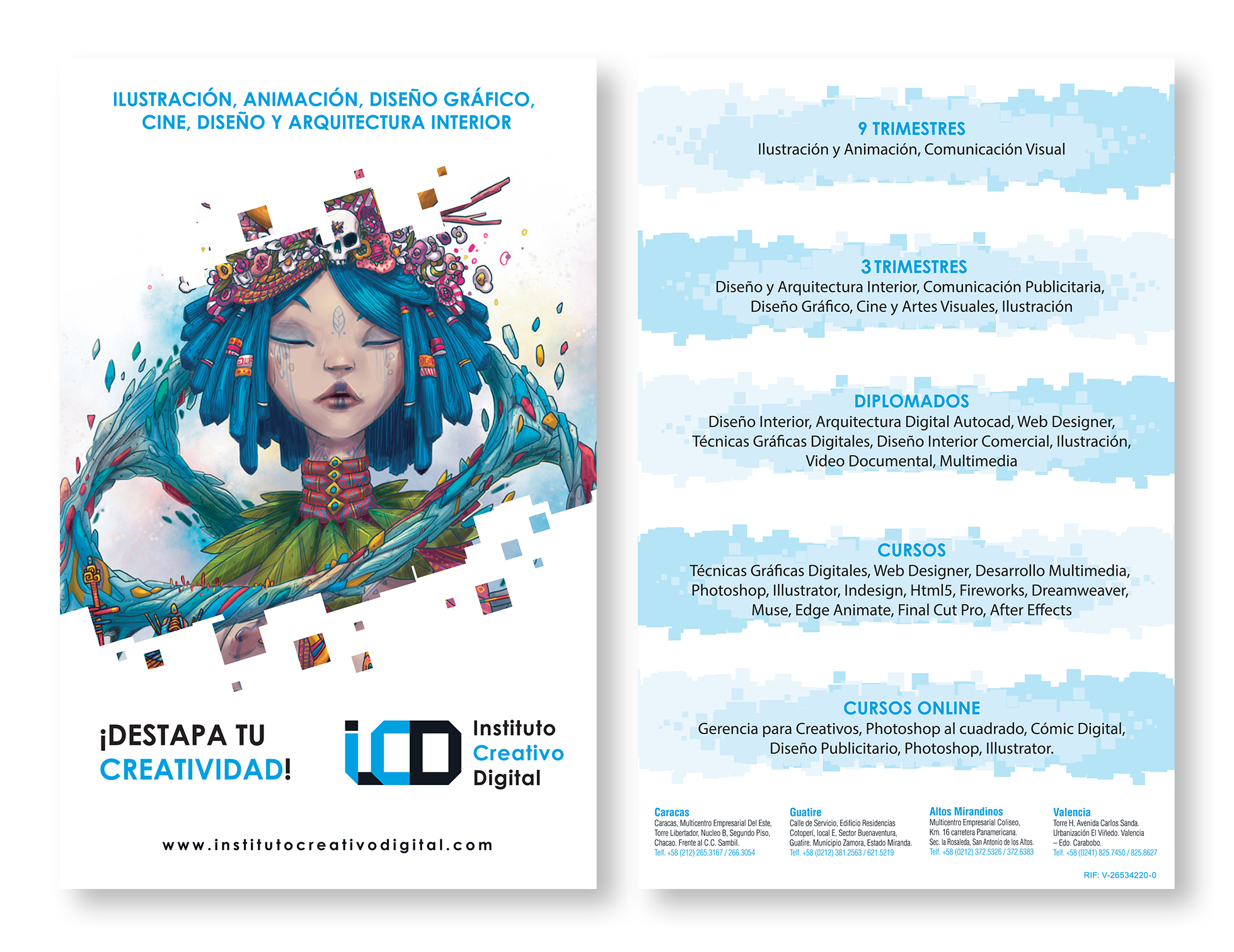 Renovación de identidad e imagen corporativa para el Instituto Creativo Digital (ICD/CDD). Durante el proyecto, se crearon diferentes productos, como un nuevo logotipo, una nueva papelería, un nuevo material POP, material publicitario y una fachada llamativa para el instituto. Se añadieron también un manual corporativo y una presentación en Power Point para explicar el uso adecuado de cada uno de los nuevos elementos gráficos del instituto.